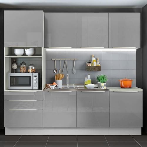 O acabamento da estrutura é branco e o das portas e frentes das gavetas é cinza. É feito em Pintura Poliéster com sete camadas de proteção resistentes a álcool, água e calor.