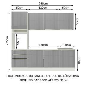 Com ótimo espaço interno, possui profundidade de cozinha planejada: 60 cm. São diversas portas, gavetas, prateleiras e nichos, perfeitos para organizar todos os utensílios da cozinha.