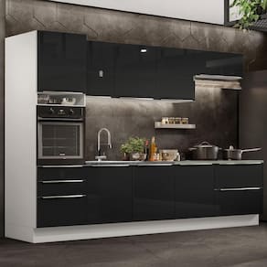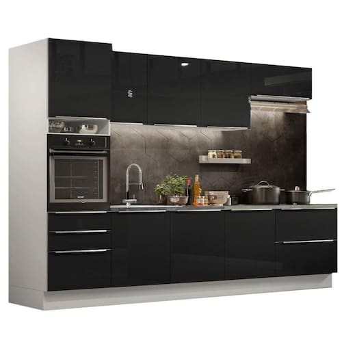 O acabamento da estrutura é branco e o das portas e frentes das gavetas é preto. É feito em Pintura Poliéster com 7 camadas de proteção resistentes a álcool, água e calor.