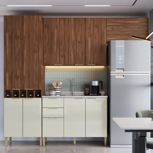 Para ter uma Cozinha moderna e aconchegante, você conta com a Linha Montenegro. É fácil deixar sua cozinha com cara de planejada. Portas com dobradiças com amortecimento, tem um fechamento suave, e as gavetas com corrediças telescópicas permitem abertura total das gavetas.