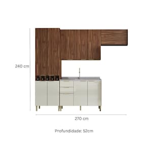 Altura: 240cm | Largura: 270cm | Profundidade: 52cm | Dimensões: 240x270x52cm (AxLxP) | Material: MDP 15mm | Manutenção e limpeza: Utilize pano umedecido com água | Quantidade de gavetas: 3 gavetas | Quantidade de portas: 10 portas | Complexidade de montagem: Média: pode ser montado por mais de uma pessoa e|ou necessite de maior conhecimento para montagem | Acompanha pia?: Não | Conteúdo da embalagem: paneleiro, balcão 120cm, aéreo 120cm, aéreo 80cm, kit ferragens e manuais de montagem | Cor: Wengue Cristalo | Tipo de puxador: Externo | Tipo de corrediças: Telescópicas | Cor interna: Wengue | Altura dos pés: 17 cm | Material dos pés: Polipropileno