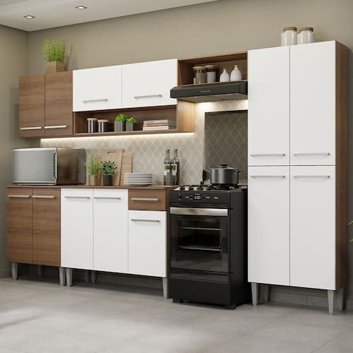Itens incls: - Um (1) Armário Aéreo de 64 cm com duas (2) portas - Um (1) Balcão de 64 cm com duas (2) portas e tampo - Um (1) Armário Aéreo de 164 cm cm com duas (2) portas e dois (2) nichos - Um (1) Balcão de 105 cm com três (3) portas, uma (1) gaveta e tampo - Um (1) Paneleiro de 65 cm com quatro (4) portas