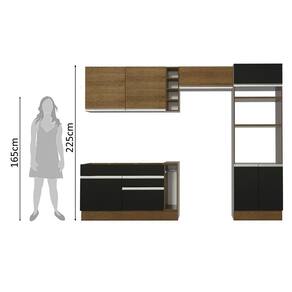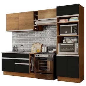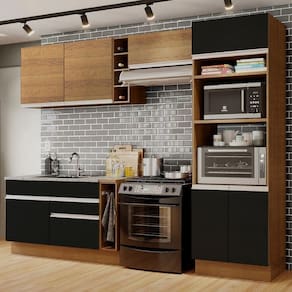 - Itens inclusos: Um balcão de pia com duas gavetas e uma porta (não acompanha tampo) | Um balcão porta panos com tampo de MDP em pintura amadeirado Rustic | Um aéreo com duas portas | Uma adega | Um aéreo com uma porta basculante | Uma torre quente com dois nichos para forno e micro-ondas, um nicho menor e trêsportas, sendo uma basculante;
