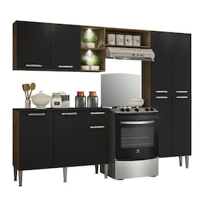 Conteúdo da Embalagem: 1 (um) armário aéreo com nicho lateral e horizontal de 166 cm 1 (um) paneleiro duplo de 62 cm 1 (um) balcão com tampo de 105 cm 1 (um) kit com 2 Luminárias LED