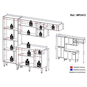 Dimensões do produto montado: Cozinha: Altura: 184 cm - Largura: 228 cm - Profundidade: 27 cm (aéreos e paneleiro) - 44,5 cm (balcão com tampo) Espaço do nicho para fogão/geladeira: Altura: 162 cm - Largura: 61 cm *Você pode consultar as medidas internas na imagem técnica do produto.