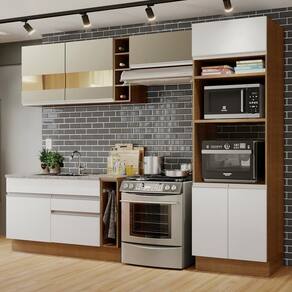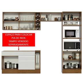 - Itens inclusos: Um balcão de pia com duas gavetas e uma porta (não acompanha tampo) | Um balcão porta panos com tampo de MDP em pintura amadeirado Rustic | Um aéreo com duas portas com detalhe em vidro Reflex | Uma adega | Um aéreo com uma porta basculante | Uma torre quente com dois nichos para forno e micro-ondas, um nicho menor e três portas, sendo uma basculante;