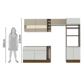 - As portas da torre e do balcão e as frentes das gavetas são brancas. As portas dos aéreos são em pintura Crema. O processo é feito em Poliéster Protetor ecológico de alta resistência, que protege o móvel dos efeitos da água, do álcool e do calor.