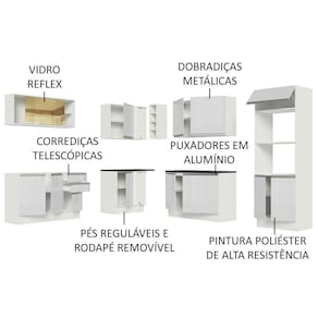 O acabamento da estrutura é branco fosco e as portas e frentes são em branco brilhante. É feito em Pintura Poliéster ecológica de alta resistência, que oferece proteção contra os efeitos da água e do calor.