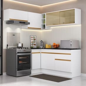 Conteúdo da Embalagem: 1 (um) armário aéreo 70cm 1 (um) armário aéreo de canto 90cm 1 (um) armário aéreo com portas de vidro 120cm 1 (um) balcão com tampo de canto 90cm 1 (um) balcão com tampo 120cm 1 (um) kit com rodapés
