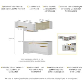 Dimensões do produto montado: Altura: 203cm | Largura: 160 x 172cm | Profundidade: 32cm (aéreos) - 53cm (balcão com tampo) *Você pode consultar as medidas internas na imagem técnica do produto.