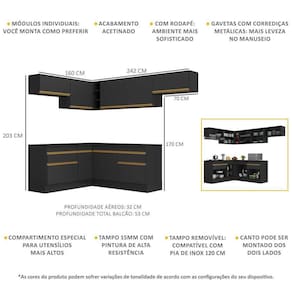 Dimensões do produto montado: Altura: 203cm | Largura: 160 x 242cm | Profundidade: 32cm (aéreos) - 53cm (balcão com tampo) *Você pode consultar as medidas internas na imagem técnica do produto.