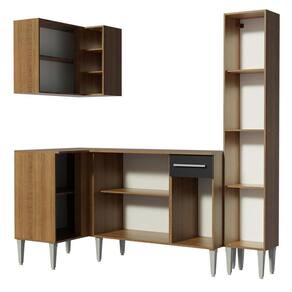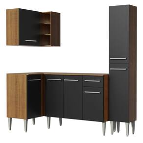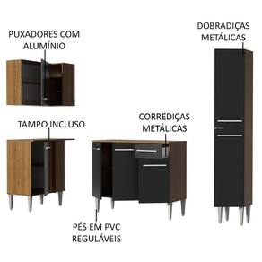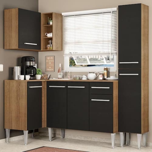 O acabamento da estrutura é no padrão amadeirado Rustic. As portas e a frente são pretas. As partes internas das costas e das gavetas são brancas. O processo é feito em Pintura Poliéster ecológica que oferecem resistência contra os efeitos da água e do calor. Os armários aéreos e o paneleiro precisam ser fixados na parede.