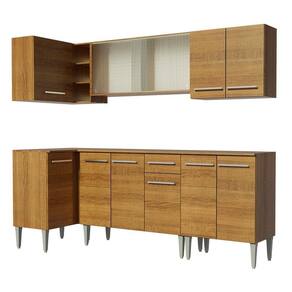 Os pés são em PVC, pensados para facilitar a limpeza e com regulagem que permite nivelar pequenas imperfeições no piso. Para completar, todos os balcões acompanham tampo em MDP. O acabamento é no padrão amadeirado Rustic, em Pintura Poliéster ecológica com 7 camadas de proteção, que oferecem resistência contra os efeitos da água e do calor. Os armários aéreos e o paneleiro precisam ser fixados na parede.