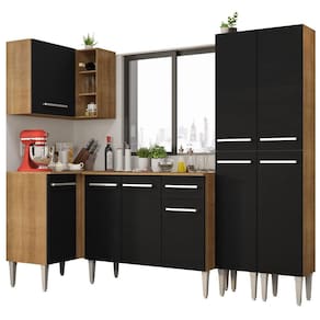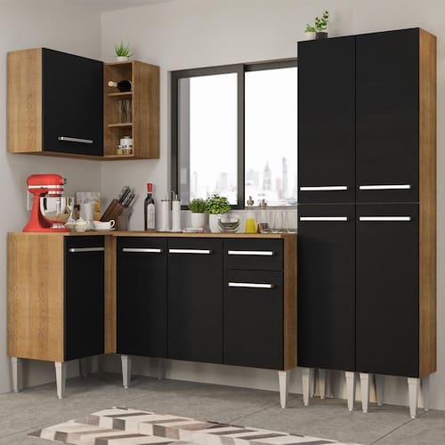 Itens inclusos: - Um (1) Armário aéreo de canto com uma (1) porta e uma (1) adega acoplada - Um (1) Balcão de canto com uma (1) portas e tampo - Um (1) Balcão com três (3) portas, uma (1) gaveta e tampo - Dois (2) Paneleiros com duas (2) portas