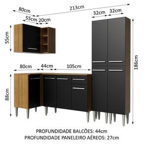 Medidas totais: 186 cm de altura x 293 cm de largura x 44 cm profundidade nos balcões e 27 cm no aéreo e no paneleiro.