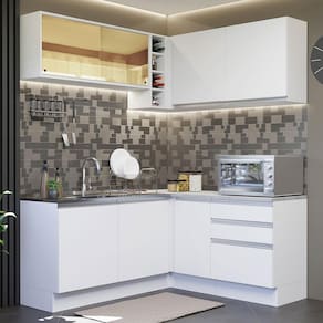 Procurando uma opção de Cozinha Completa para renovar a sua casa com muito espaço, conforto e design moderno? Confira esta versão de canto da linha Glamy da Madesa.
