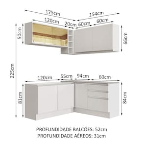 - 52 cm nos módulos inferiores e 31 cm nos aéreos