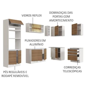 O acabamento da estrutura é branco e as portas e frentes são em amadeirado Rustic. O processo é feito em Pintura Poliéster com 7 camadas que protegem o móvel dos efeitos do álcool da água e do calor.