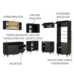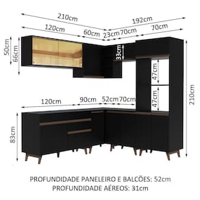 - Itens inclusos: Um (1) Aéreo de 120 cm com duas (2) portas de correr de vidro; Um (1) Balcão de 120 cm com uma (1) porta, duas (2) gavetas e tampo; Um (1) Aéreo de Canto com uma (1) porta; Um (1) Balcão de Canto com uma (1) porta e tampo; Um (1) Aéreo de 70 cm com uma (1) porta basculante; Um (1) Balcão de 70 cm com duas (2) portas e tampo; Uma (1) Torre quente de 70 cm com três (3) portas, sendo uma delas basculante