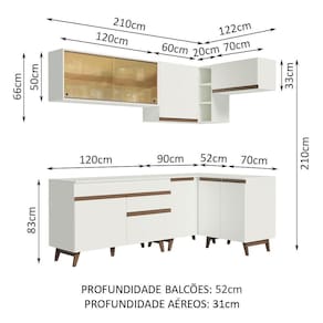 Os materiais são de alto padrão, como puxadores embutidos em alumínio, dobradiças metálicas e gaveta com corrediças de metal. Dois grandes destaques desta versão são os pés em madeira e o aéreo com portas de correr em vidro reflex, que deixam a cozinha ainda mais bonita.
