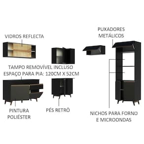 Por seu tamanho, é perfeita para organizar toda louça, utensílios e eletros. Além disso, todos os balcões acompanham tampo em MDP, que podem ser removidos para colocação de pia e/ou cooktop. A torre quente comporta forno e micro-ondas e possui abertura para dissipação do calor.