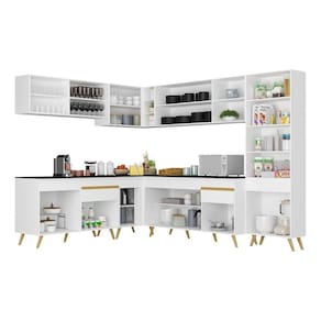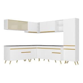 Conteúdo da Embalagem: 1 (um) armário aéreo com portas de vidro 120cm 1 (um) armário aéreo de canto 90cm 1 (um) armário aéreo 150cm 1 (um) balcão com tampo 120cm 1 (um) balcão com tampo de canto 90cm 1 (um) balcão com tampo 150cm 1 (um) paneleiro 62cm