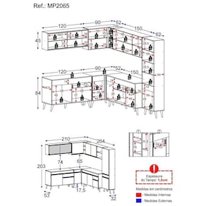 Dimensões do produto montado: Altura: 203cm | Largura: 210 x 264cm | Profundidade: 32cm (aéreos e paneleiro) - 53cm (balcão com tampo) *Você pode consultar as medidas internas na imagem técnica do produto.