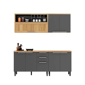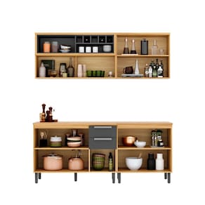 O conjunto de cozinha New Porto da Itatiaia combina modernidade, funcionalidade e acabamento de alto padrão em uma solução completa para seu ambiente. Com 200cm de largura, esse conjunto é composto por dois módulos inferiores (balcões) e dois armários aéreos, oferecendo excelente aproveitamento de espaço e um visual sofisticado. Produzido 100% em MDF, conta com acabamento grafite e detalhes amadeirados, além de pintura eletrostática UV que garante resistência e uniformidade. Os balcões incluem: 1 balcão de 120cm com 3 portas e 2 gavetas 1 balcão de 80cm com 2 portas Já os armários aéreos são: 1 aéreo de 120cm com 1 porta horizontal, nichos e garrafeiro embutido 1 aéreo de 80cm com 2 portas Todos os módulos contam com pés reguláveis, puxadores modernos e excelente capacidade interna. As gavetas possuem corrediças metálicas que garantem praticidade no uso diário, e os nichos abertos nos armários aéreos proporcionam um toque decorativo e funcional. Ideal para quem busca sofisticação e organização sem abrir mão da qualidade e do design contemporâneo.