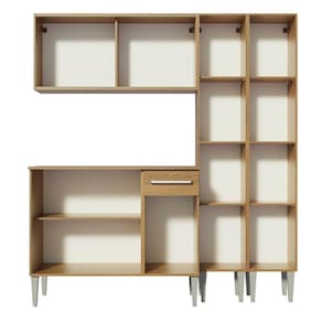 - Itens inclusos: Dois Paneleiros com duas portas cada | Um Armário Aéreo com duas portas em vidro e dois nichos internos | Um Balcão com três portas, uma gaveta e tampo