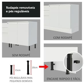 O balcão maior suporta pias de inox ou pedra, no tamanho de 120 cm x 52 cm. Para completar, os pés são reguláveis em PVC e o rodapé removível em MDP, com encaixe fácil para retirar na hora da limpeza.
