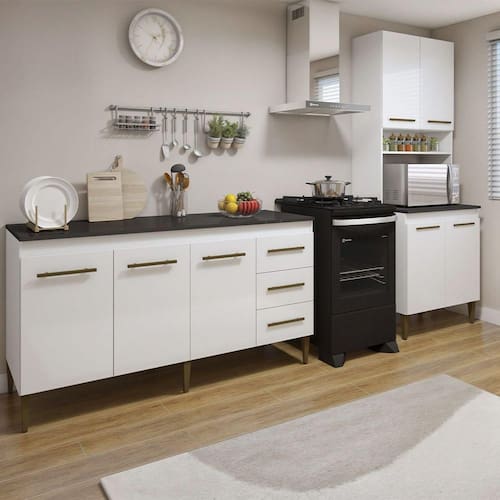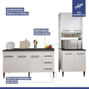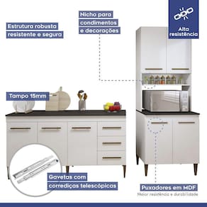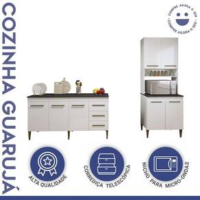 Caracteristicas: Modelo: Guaruja Marca: Kaiki Moveis Material Principal: MDP Material da Corredica: Metalica Material da Dobradica/Corredica da Porta: Metalica Material da Porta: MDP Acabamento: Pintura Acabamento da Gaveta: Pintura Escala de Brilho: Semi-Brilho Escala de Brilho da Gaveta: Semi-Brilho Material dos Pes: ABS Material do Tampo: MDP Acabamento da Porta: Pintura Material da Gaveta: MDP Material do Puxador da Gaveta: MDF Tipo de Corredica da Gaveta: Metalica Telescopica Acabamento dos Pes: Pintura Escala de Brilho da Porta: Semi-Brilho Material do Puxador da Porta: MDF Acabamento da Prateleira: Pintura Escala de Brilho da Prateleira: Semi-Brilho Material da Prateleira: MDP Tipo de Dobradica da Porta: Simples Quantidade de Prateleiras: 04 Prateleiras Quantidade de Gavetas: 03 Gavetas Balcao Suporta Pia: Nao Acompanha Rodape Decorativo: Nao Tipo de Porta: Bater Suporta Ate (kg): 120 kg Possui Vidro: Nao Possui Rodizio: Nao Possui Prateleiras: Sim Possui Portas: Sim Possui Pes: 10 Altura dos Pes: 17 cm Possui Gavetas: Sim Peso Maximo por Prateleira: 10 kg Gaveta com Chave: Nao Estilo: Moderno Pes Regulaveis: Nao Possui Recorte para Cooktop: Nao Sapatas Niveladoras: Nao Peso Maximo por Gaveta: 5 kg Tipo de Puxador da Gaveta: Externo Tipo de Puxador da Porta: Externo Modular: Sim Tipo de Armario de Cozinha: Cozinha Compacta Origem do Produto: Nacional. Quantidade de Pecas: 2 Ambiente Principal: Cozinha Balcao Acompanha Pia: Nao Acompanha Tampo: Sim Espessura do Tampo (mm): 15 mm Necessita Montagem: Sim Complexidade da Montagem: Alta: deve ser montado por um montador especializado Sistema de Montagem: Parafusos e Cavilhas. Recomendacoes de Uso, Manutencao e Limpeza: Limpar com pano macio e levemente umedecido. Nao utilizar solventes a base e de inflamaveis. Nao utilizar produtos abrasivos.