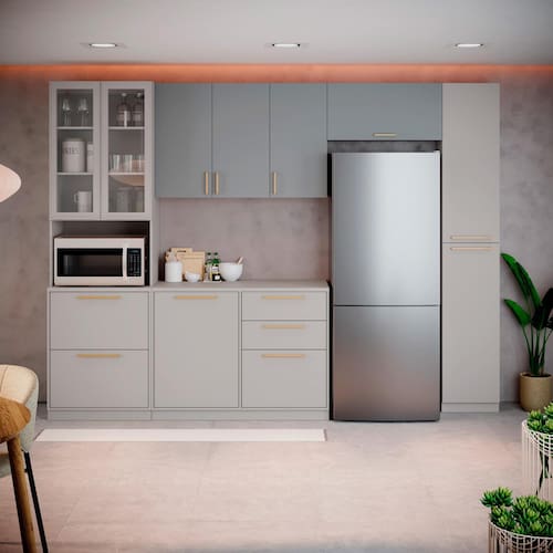 Composta por Paneleiro 3 Portas com nicho para forno e micro-ondas, Balcão Triplo com 1 porta e 3 gavetas, Armário Aéreo Triplo com amplo espaço interno, Armário de Geladeira e Paneleiro 2 Portas, oferece múltiplos compartimentos para acomodar utensílios, panelas, louças e mantimentos de forma organizada.