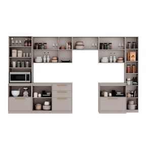 A Cozinha Completa Itatiaia Essence 7 Peças é linda, sofisticada, durável e mantém tudo organizado em um único conjunto. Fabricada em MDF de 25mm com pintura UV em tom Fendi, traz aconchego e elegância ao ambiente, além de rodapés impermeáveis 100% resistentes à água que garantem maior durabilidade.