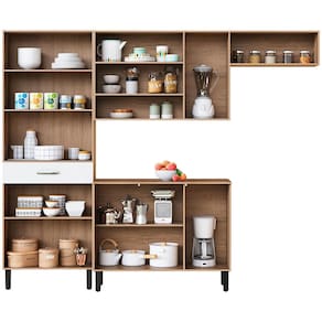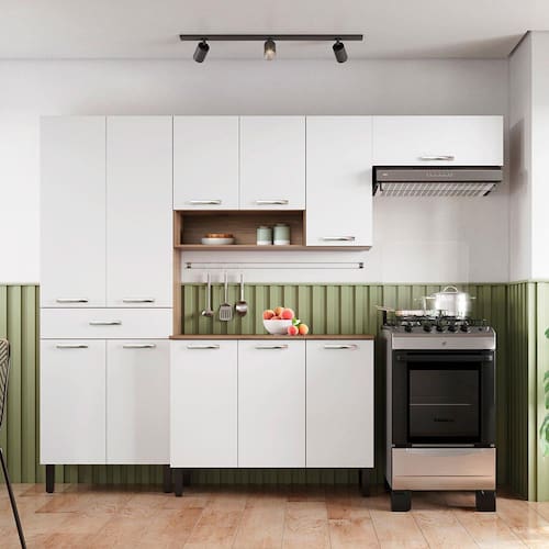 Além de todos esses recursos, essa belíssima cozinha ainda oferece um design bem atual, prateleira fixa para melhor aproveitamento do móvel e uma coloração incrível capaz de se adaptar em diferentes tipos de decoração.