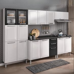 A Cozinha Completa Itatiaia Tarsila 280cm em Aço Branco/Preto combina sofisticação e praticidade com um visual moderno e impactante. Produzida em aço com pintura eletrostática a pó, ela oferece alta durabilidade e um acabamento impecável. Os puxadores em alumínio com ponteiras em ABS cromado elevam o visual, trazendo um toque refinado e atual.