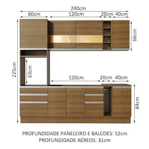 - Dimensão total do produto (AxL): 225 x 240cm | Profundidade balcões e paneleiro 52cm e aéreos 31cm