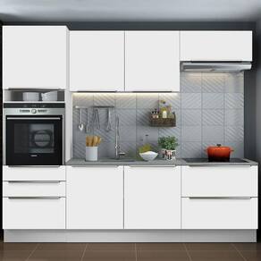 O espaço interno é ótimo, com profundidade de cozinha planejada: 60 cm. Além disso, é fabricada com itens de qualidade superior, como corrediças telescópicas, puxadores em alumínio e dobradiças com amortecedores para o fechamento suave das portas.