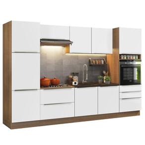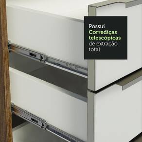O acabamento da estrutura é em amadeirado Rustic. As portas e frentes das gavetas são em Branco Veludo. As partes internas das costas e das gavetas são brancas. É feito em Pintura Poliéster com 7 camadas que protegem o móvel dos efeitos do álcool da água e do calor.