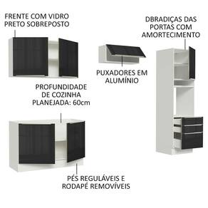 Todos os puxadores são em alumínio, mais resistentes ao uso diário e os pés são reguláveis em PVC, com rodapé removível para facilitar na hora de fazer a limpeza.