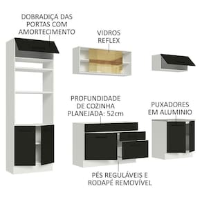 Os materiais utilizados na fabricação são de padrão superior, como os puxadores com alça em alumínio, gavetas com corrediças telescópicas de abertura total, vidros reflex no aéreo e as portas com amortecimento para fechamento suave.