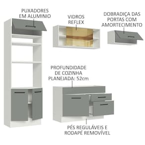 Fabricada com alto padrão de qualidade, possui puxadores com alça em alumínio, gavetas com corrediças telescópicas de abertura total, vidros reflex no aéreo e as portas com amortecimento para fechamento suave.