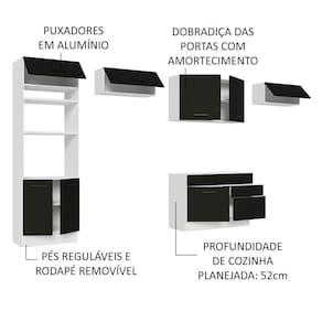 O acabamento da estrutura é branco e as portas e frentes são pretas. É feito em Pintura Poliéster ecológica com sete camadas, que destaca a tonalidade e protege o móvel.