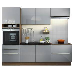 As medidas totais da cozinha são: 260 cm de largura x 225 cm de altura. A profundidade é de 60 cm nos módulos inferiores e 31 cm nos aéreos. O balcão maior comporta pias de 120 cm x 60 cm e não acompanha tampo.