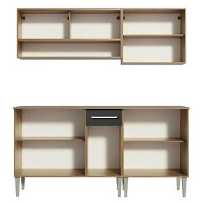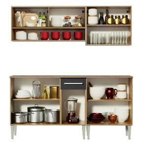 O espaço disponível é perfeito para deixar tudo bem organizado. São dois balcões e dois armários aéreos, todos fabricados com materiais de qualidade, como puxadores com detalhe em alumínio e corrediças e dobradiças metálicas. Além disso, os módulos são separados e podem ser montados conforme a necessidade do seu ambiente.