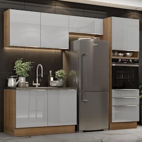 Toda a linha é fabricada com itens de qualidade superior, como corrediças telescópicas, dobradiças metálicas e amortecedores para o fechamento suave das portas. Além disso, o espaço interno é ótimo, com profundidade de cozinha planejada: 60 cm.