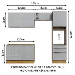 As medidas totais da cozinha são: 260 cm de largura x 225 cm de altura. A profundidade é de 60 cm na torre e no balcão e 31 cm nos aéreos. O balcão comporta pias de 120 cm x 60 cm e não acompanha tampo.