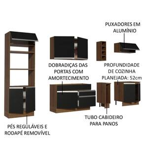 O balcão de pia comporta pias de 120 cm x 52 cm. Já o balcão para cooktop segue com tampo de 80 cm x 52 cm que pode ser recortado para a colocação do cooktop. Possui também pés reguláveis e rodapé removível.