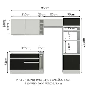 As medidas totais da cozinha são: 290 cm de largura x 225 cm de altura. A profundidade é de 52 cm nos balcões e no paneleiro e 31 cm nos aéreos.