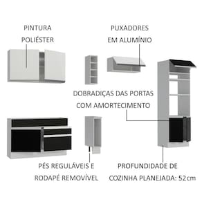 As gavetas contam com corrediças telescópicas e todas as portas possuem dobradiças com amortecimento para o fechamento suave. Além disso, todos os módulos são separados, assim você tem a possibilidade de montar a cozinha dos seus sonhos, conforme a necessidade do seu espaço.
