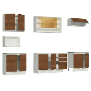 Itens inclusos: - Um (1) armário aéreo de 80 cm com duas (2) portas - Um (1) nicho de 60 cm para forno - Um (1) armário aéreo de 120 cm com duas (2) portas de correr de vidro Reflex e um (1) nicho - Um (1) balcão de 120 cm com duas (2) portas, três (3) gavetas (não acompanha o tampo deste balcão) - Um (1) armário aéreo de 80 cm com uma (1) porta basculante com pistão a gás - Dois (2) balcões de 80 cm, cada um com duas (2) portas e tampo em MDP em pintura Mood